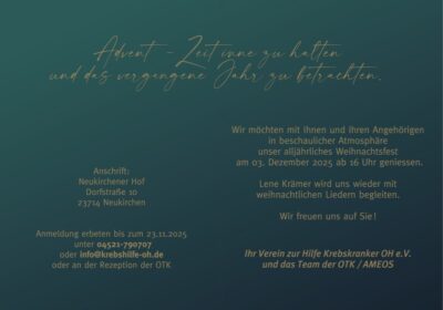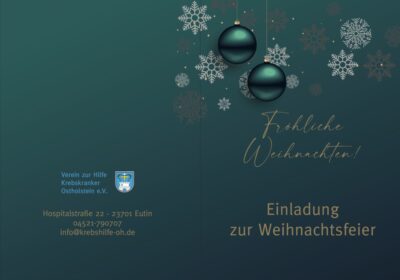 Eine Weihnachtsfeier für Patienten, Angehörige und Mitarbeiter der Onkologischen Tagesklinik Eutin veranstaltet der Verein zur Hilfe Krebskranker Ostholstein am Mittwoch, 03. 12. 2025 ab 16 Uhr im Neukirchener Hof.